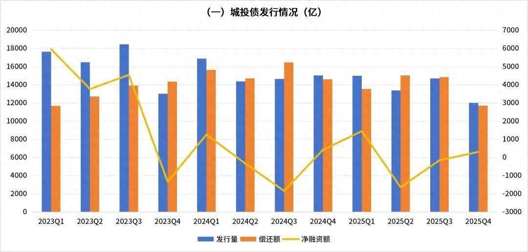 报告显示,2025年,城投债发行规模为55,115.27亿元,同比下降约10%,净融资额为-26.66亿元,近十年来低位,城投债市场从“增量扩张”转向“存量消化”阶段;