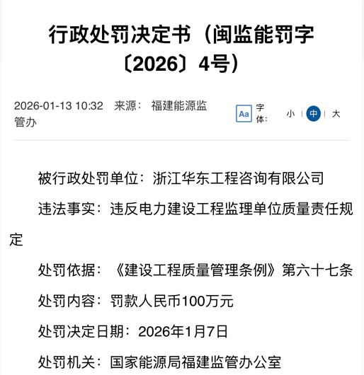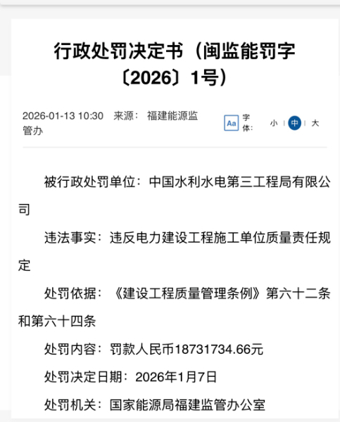 1月13日,国家能源局福建监管办公室发布了三则《行政处罚决定书》(闽监能罚字【2026】1号、2号、4号),福建永安抽水蓄能电站的施工、业主、监理三家单位合计被罚超1978万元。